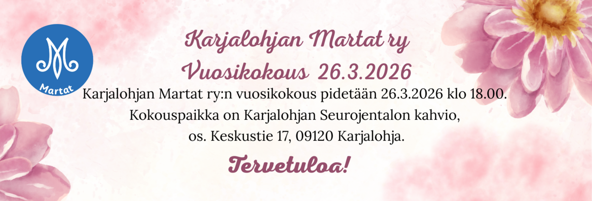 - Pe 20.3.2026 klo 15:00 alkaen kuorintatalkoot Pohjolan Pidot -juhlaruokiin Åsvallassa, (os. Nummentie 39, Lohja). Ilmoittautumiset talkoisiin: karjalohjanmartat45@gmail.com tai tekstiviesti numeroon 050 522 6122.